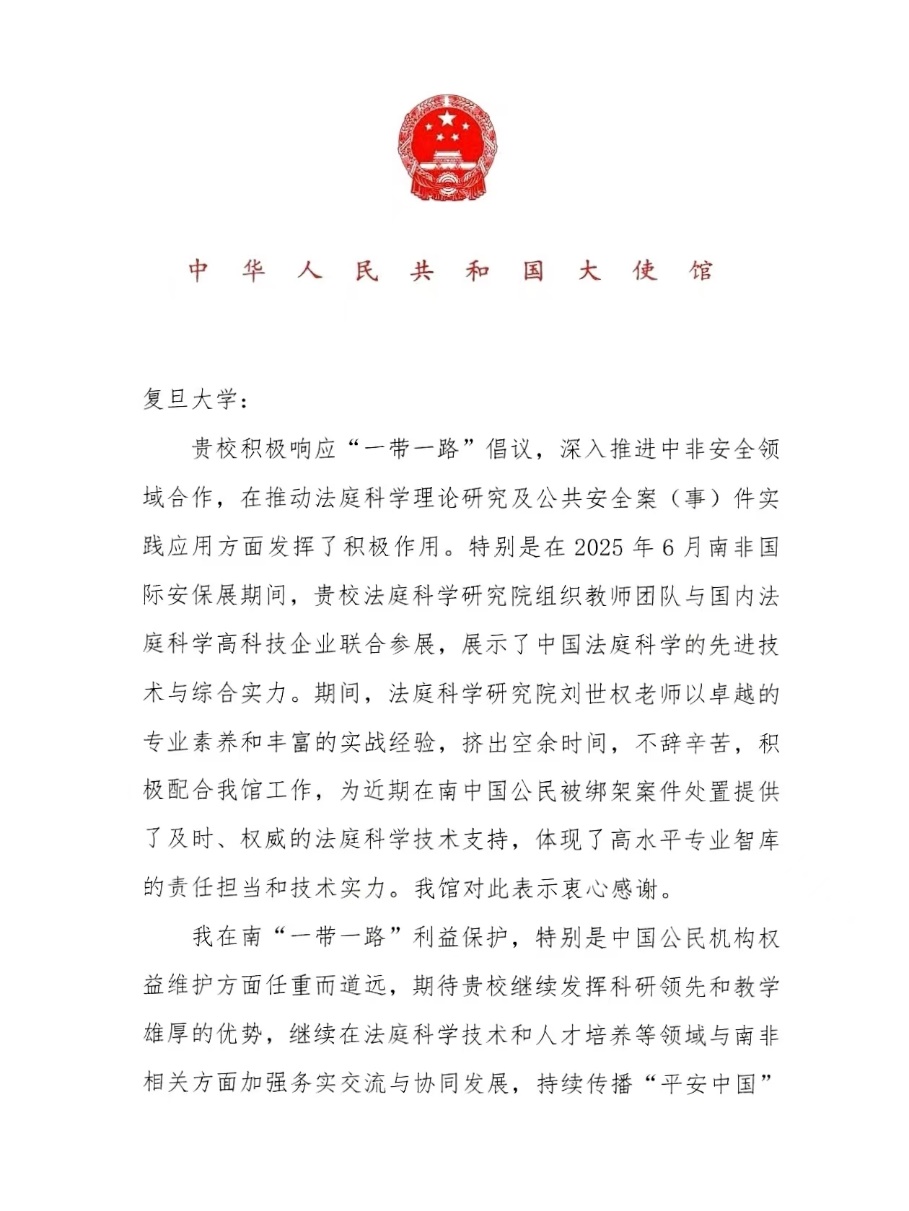 日前,复旦大学收到了一封特殊的信函——中华人民共和国驻南非共和国大使馆发来的感谢信。信中高度肯定学校积极响应一带一路倡议,特别是复旦法庭科学研究院在2025年非洲国际安保展中展示的先进技术与综合实力。
