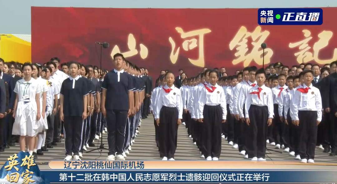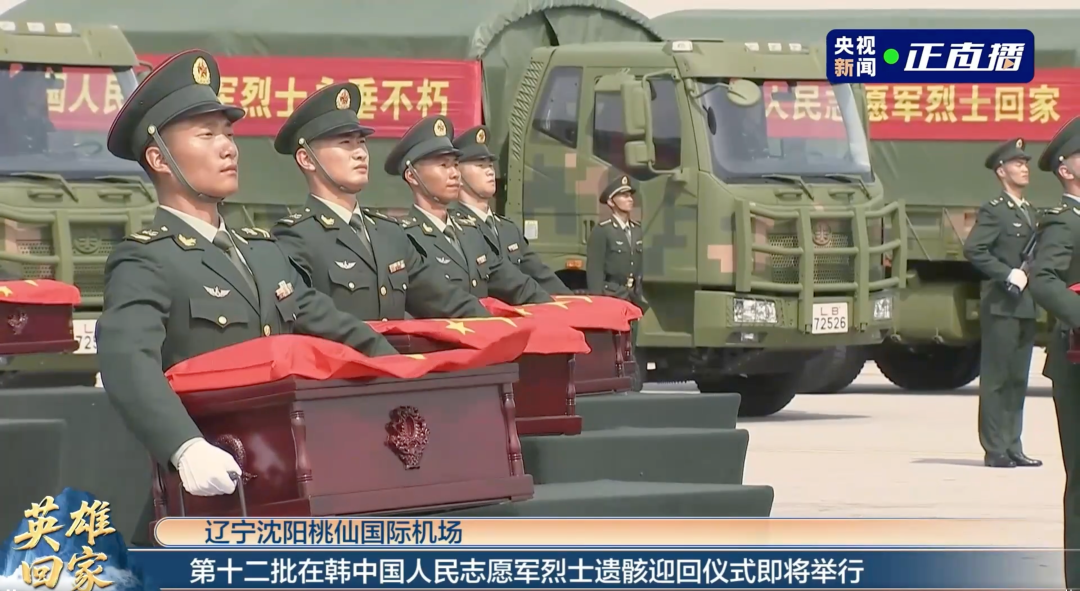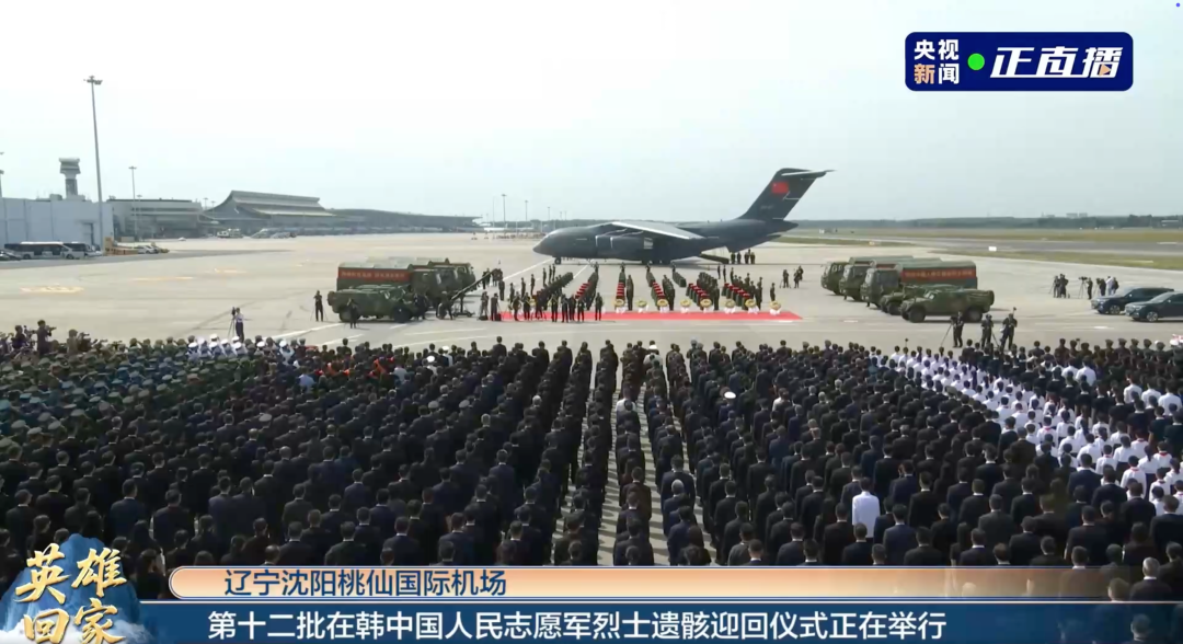 青山忠骨,英雄回家。9月12日至13日,第十二批30位在韩中国人民志愿军烈士遗骸及相关遗物由空军运-20专机接运回国,在沈阳桃仙国际机场庄严迎回,并隆重安葬于沈阳抗美援朝烈士陵园。至此,已有1011位志愿军烈士遗骸回归故土。